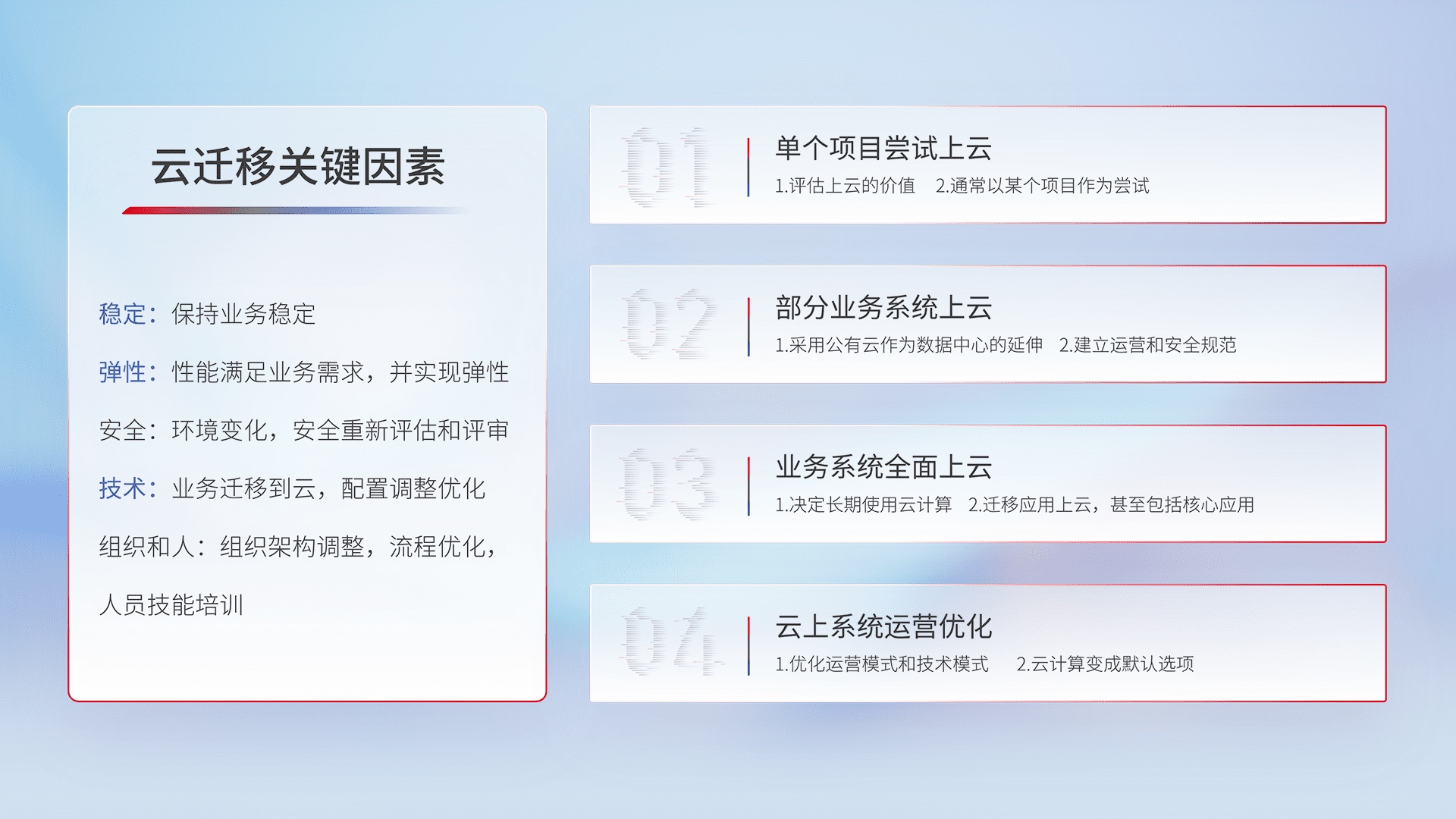 结合实际业务,,,,从规划设计、、、、云平台选型、、、云原生改造、、、、数据迁移、、、、集成交付,,,迁移全过程为客户识别最佳上云路径,,,,做好风险识别管理,,,,设计网络架构、、、、身份权限、、安全审计合规、、、、操作审计、、、日志审计、、、监控告警策略、、、、多站点容灾设计等,,,,对云上基础设施进行整体规划,,,提升IT治理水平,,,,以满足弹性、、、高可用、、、高性能的需求。。。。