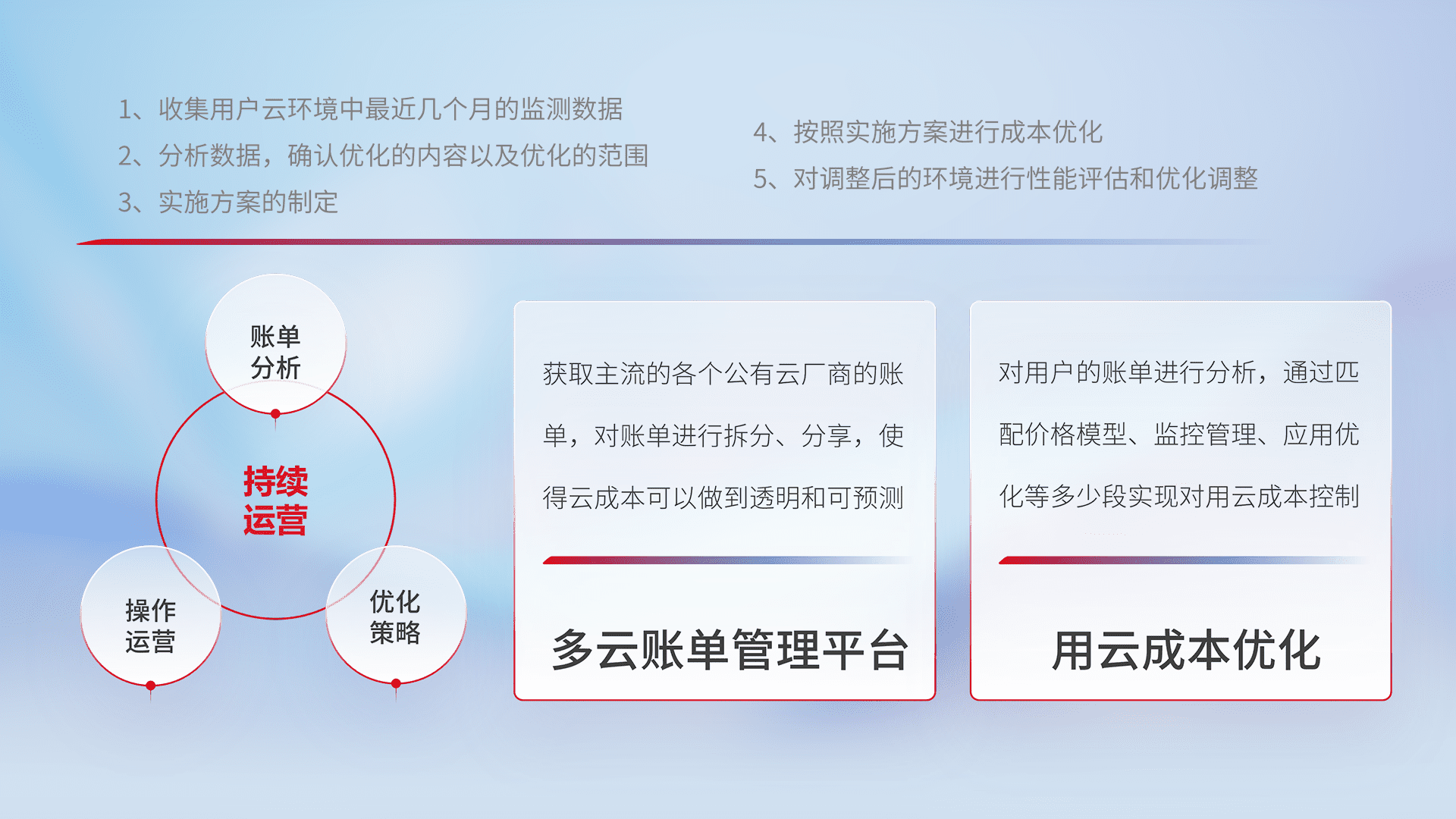 通过多云纳管,,以统一的资源数据模型把客户的云资源进行抽象和封装,,进而实现对多云资源的统一操作,,保障云资源管理的可靠性、、、稳定性与可用性。。。量身定制化运维内容,,,配置、、开发运维、、、、补丁管理、、、、备份、、监控、、认证和访问管理、、、审计和日常巡检等,,,保障在用云过程中的可靠度,,稳定度以及高可用率。。。。