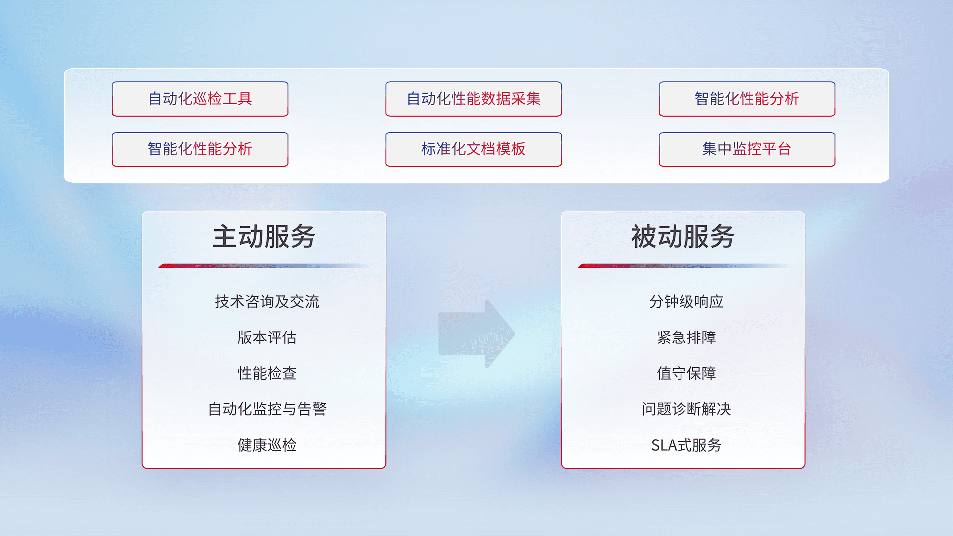 智能化工具和标准化文档,,,保障服务质量,,,,提供主动服务(包含技术咨询、、、版本评估、、、、性能检查、、自动化监控与告警、、、健康巡检)和被动服务包含(分钟级响应、、、、紧急排障、、值守保障、、、问题诊断解决、、SLA服务)。。。。